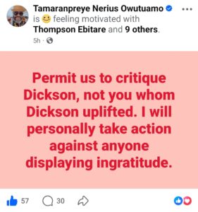 In a facebook post credited to him on 28 February, the APC assistant scribe stated emphatically that, “criticism should be directed at Dickson by people like us; not by those who rose because of him. I find it deeply troubling when beneficiaries turn around to drag the very person who helped them.